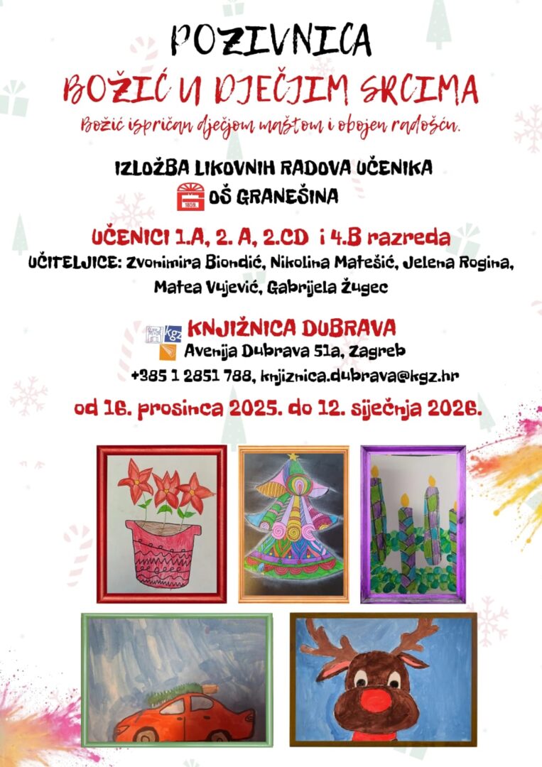Učenici 1.A, 2.A, 2.CD i 4.B razreda OŠ Granešina sudjeluju u izložbi „Božić u dječjim srcima“ uz vodstvo svojih učiteljica Nikoline Matešić, Mateje Vujević, Zvonimire Biondić, Jelene Rogine i Gabrijele Žugec.