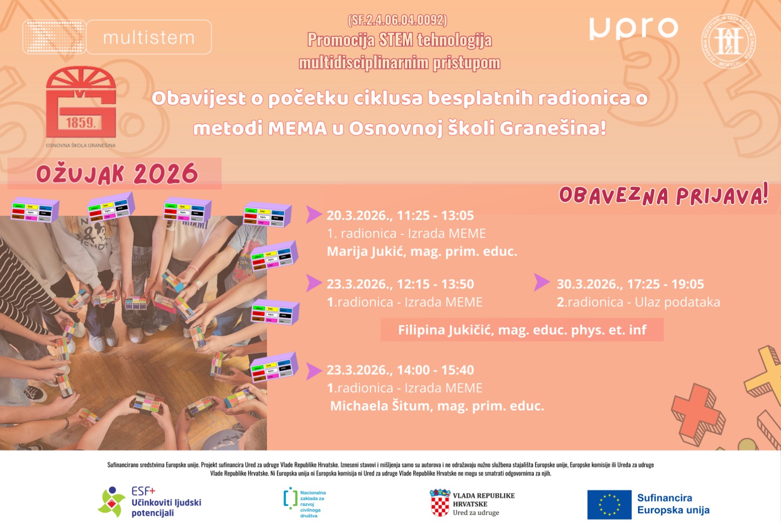 u okviru europskog projekta “Promocija STEM tehnologija multidisciplinarnim pristupom – MULTI-STEM” pozivamo vas da sudjelujete u ciklusu radionica koje će vam pružiti priliku da naučite i primijenite metodu MEMA (Metoda Evaluacije, Mjerenja i Analize), koju je izvorno razvila prof. dr. sc. Marina Čičin Šain.